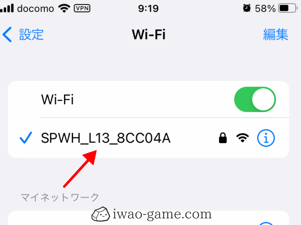 スマホ等のインターネット設定を確認すると、画像のような型番のWi-Fiが飛んでいるので、付属のパスワード(本体底面に書いてある暗号化キー)を入力してください。